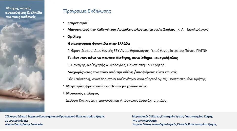 Μέσα από ομιλίες για την ανακουφιστική φροντίδα, το «ολικό» αποτύπωμα του πόνου στο σώμα και στην ψυχή, τη διάκριση ανάμεσα στον πόνο και την οδύνη, καθώς και μέσα από βιωματικές μαρτυρίες, επιχειρείται να αναδειχθεί ότι ο πόνος δεν είναι μόνο σωματικός, αλλά επηρεάζει την ψυχική, κοινωνική και πνευματική ζωή του ανθρώπου.
